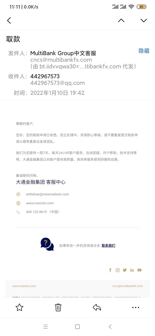 大通金融平台我1月6号出金1000美元,1月10号出金5000美元。一个多星期了,联系客服催一下加急。好久了,也没有扣款,是不是平台出金有问题,在你们平台做了3年了,一直都不错,这次让我失望了
