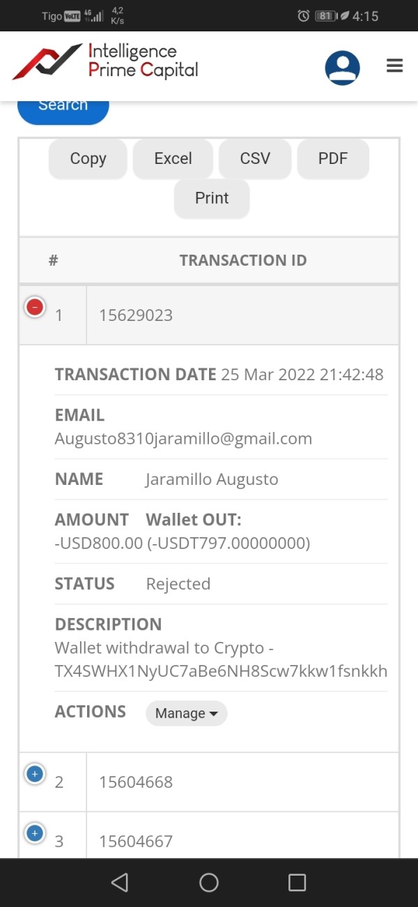 Desde el día 25 de marzo solicité un retiro a mi wallet personal y el retiro fue rechazado... El dinero del retiro no ha sido tampoco devuelto a mi backoficce y no aparece por ninguna parte... Solo en estado rechazado. Adjunto evidencia ya que es preocupante todo lo que sucede en este momento con intelligence prime capital.