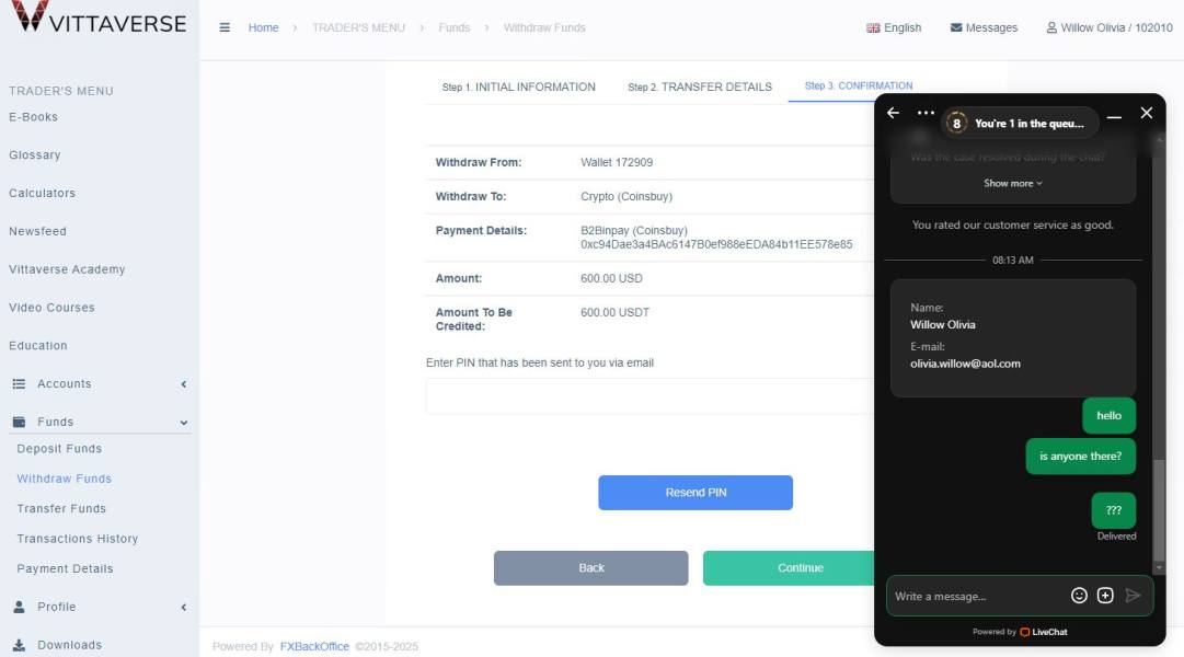 I was depositing with Vittaverse 600 usd in my account 691959 and traded for about a month but when I wanted to make my first withdrawal they were canceling all my profits. I can not even withdraw my deposit as they are not sending me the withdrawal pin code. I have been emailing Support for assistance and spoke to customer service live chat but no one is willing to help me withdraw my money. Do not waste time trading with people like this... you will not see even your deposit money