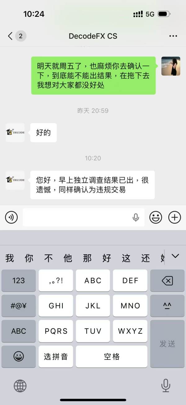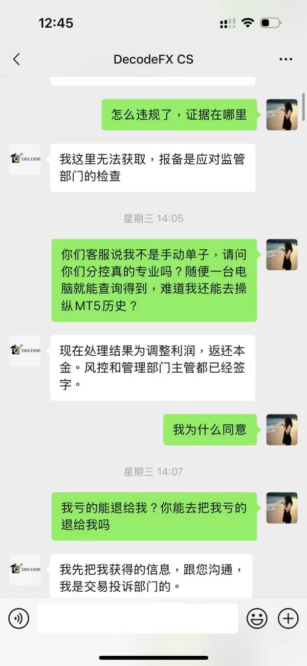 你好,我做外汇交易也有五六年了,之前只听说黑平台但从来没遇到过,这次也是让我长见识了,我在网上看到DecodeGlobal的信息就开户入金了,4月20号我从中午到晚上11点多一直陆续做单,全程就一个手机MT5上下单,因为之前好几个账号都爆仓了也特别上头,就下单的时候一直按下单键,账户一开始入的8300美金做黄金亏损到只剩2000美金了因为仓位比较重看着马上就没了点了全部平仓,随后又补了15000美金进去继续上头疯狂按下单键,中间账号之前爆剩下的加上后面入的15000总17000美金最大浮亏10000多美金,账号一直保证金不足100%红的甚至被强平了4单,后边是硬生生扛回来了还赚了19000美金,就这decode平台还说我违规,说我不是手工单说我什么点差套利,后面直接给观摩发过去了,历史记录资金曲线清清楚楚,每一单都是移动端交易,账户中间不是要爆了就是被强平,然后Decode还是说我违规但是只字不提我为啥违规,我反复文为啥违规就一直说保密,后面海派了个所谓的Decode澳洲总部的调解员来加我微信,上来就是协商利润我直接不同意,然后又来了个什么第三方独立调查一直拖着我,然后今天又给我说还是判定违规我还是问为啥违规,原文回复此交易调查无法提供给您,针对监管们核查,我对着平台也是够够的了,亏了肯定不会退回,拿命赚了点钱就说你违规。