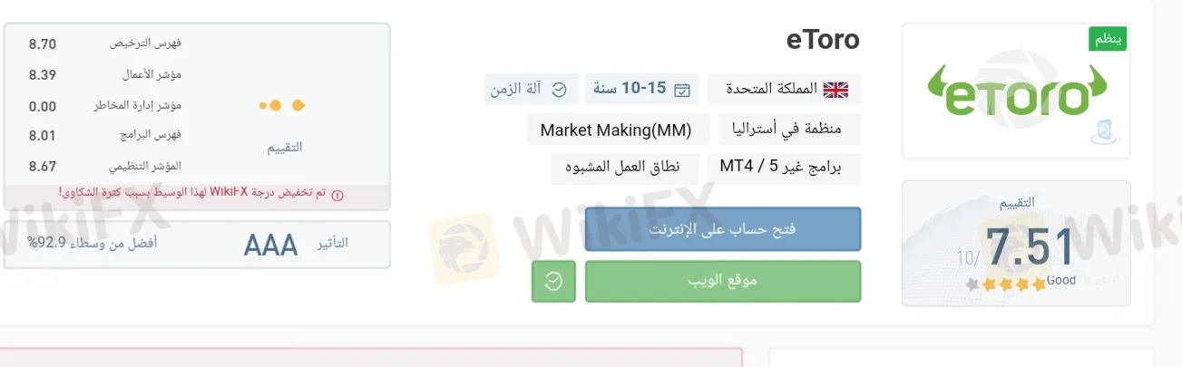 تأسست شركة Broker eToro في عام 2007. تضع الشركة نفسها كمنصة تداول اجتماعي عملائها هم تجار من أكثر من 140 دولة. لدى الوسيط عدة أقسام تعمل في ولايات قضائية مختلفة ولديها تراخيص مختلفة من المنظمين.