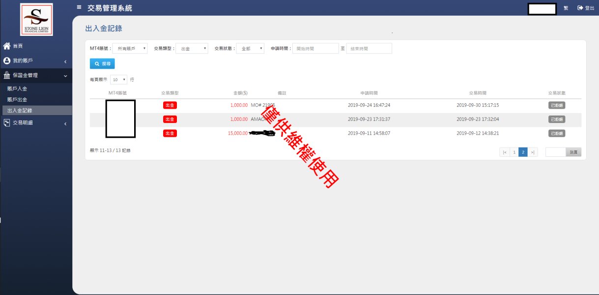 投訴Stone Lion 無法正常出金,多次要求上繳保證金解凍,現帳戶內有大量資金無法提現其中有繳過一次保證金,因跟入金公司有聯繫,故最後讓Stone Lion公司確認已完成出金(表示解凍),但後來又說因有騷擾該公司,故退回保證金(但先為入金公司通知覺得有問題先退回,而非Stone Lion公司要求才退回),而後Stone Lion公司表示,由於退回,故需再次繳納保證金。