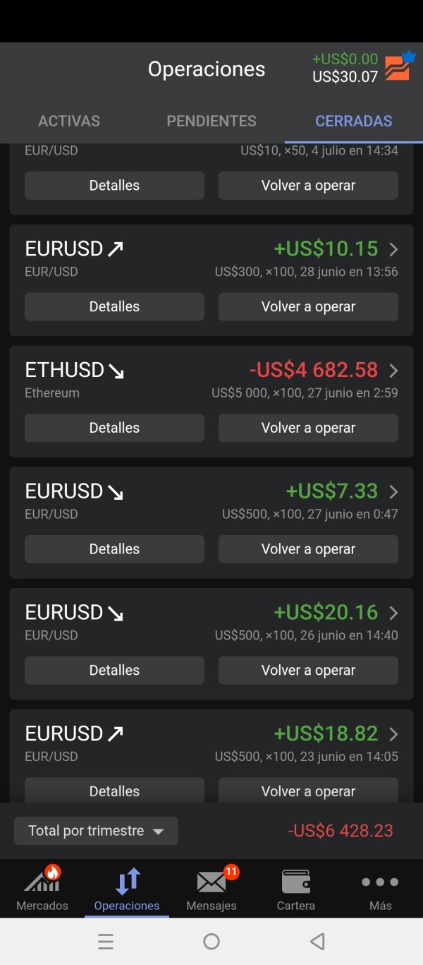 El 27 de junio apareció en mi cuenta una operación que nunca realice.Hice el reclamo respectivo y primero me indicaron que no tenían responsabilidad ya que supuestamente yo no había cuidado la clave.Luego al insistir e indicar que nunca perdí ni compartí con nadie mi clave me indicaron que la operación salió del mismo equipo en el que realice la última operacio que fue en el par euro dólar está claro que no hubo tal perdida de clave .la última operación la cerre a las 8y42 de la noche y me fui a dormir lleve mi teléfono a mi habitación y nadie puede haberlo operado porque tiene contraseña y además la operación se abrió a las 2 de la mañana hora en que estaba dormido como todos eni casa.Luego de eso para retirar lo poco que quedó Demi cuenta todo un problema.