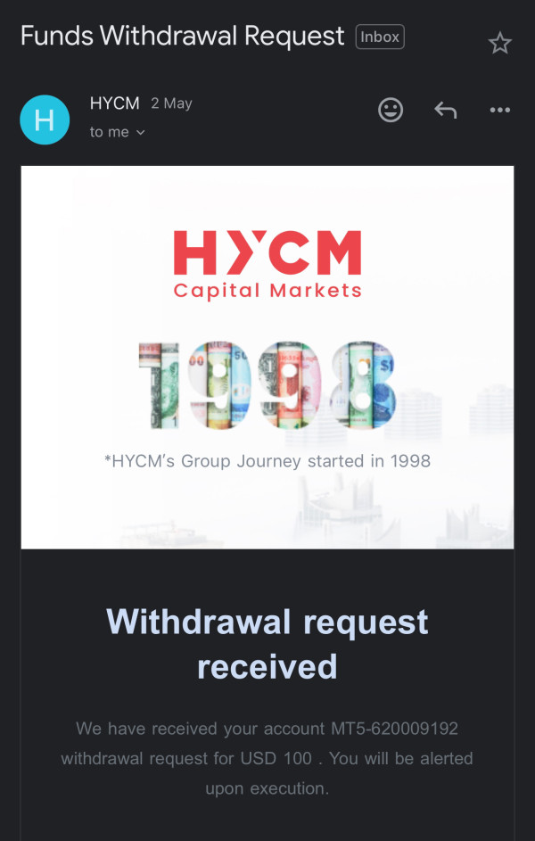 I requested withdrawal yesterday and they said within 24 hours it will complete and you fund will be withdraw and today is Friday and they said your withdrawal will be complete in monday the withdrawal process in HYCM broker are so slow and bad .