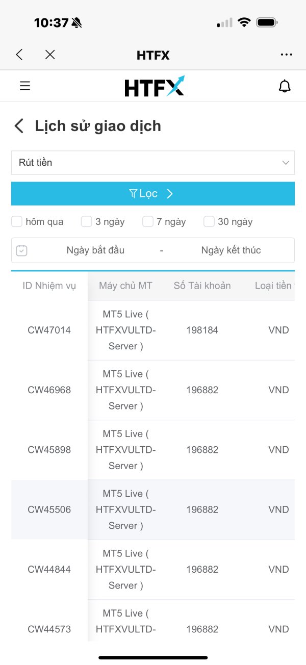 Tôi tên là : Trần thị Tâm hiện đang sinh sống và làm việc tại Việt Nam. Tôi mở tài khoản giao dịch tại sàn HTFX từ khoảng tháng 05/2025 Gần đây nhất tôi có nạp tiền vào sàn Htfx để giao dịch nhưng sau một vài tháng giao dịch không hiệu quả , nên tôi quyết định làm lệnh rút tiền. Ngày 11/07/2025, tôi tiến hành làm lệnh rút tổng số tiền 5.000 USD từ tài khoản giao dịch về tài khoản ngân hàng cá nhân. Tuy nhiên, đến nay (ngày 16/08/2025), lệnh rút vẫn chưa được xử lý dù tôi không vi phạm bất kỳ quy định nào của sàn, không nhận được lý do rõ ràng hay bất kỳ phản hồi chính thức nào từ phía HTFX. Tôi đã gửi nhiều email và tin nhắn yêu cầu giải thích, nhưng đều bị phớt lờ hoặc trả lời vòng vo, không cung cấp thông tin cụ thể về thời gian xử lý rút tiền. Điều này khiến tôi nghi ngờ sàn HTFX có dấu hiệu chiếm dụng vốn của nhà đầu tư, không đảm bảo quyền lợi hợp pháp cho khách hàng.