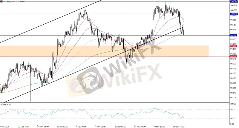 Technically, the Dollars drop below 100 signals growing bearish pressure. A sustained break below this level could indicate an imminent trend reversal.