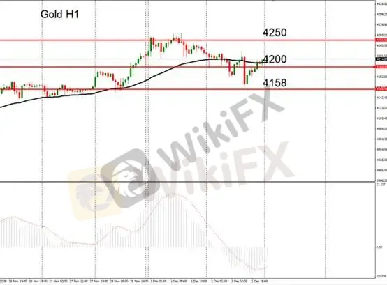 On the H1 chart, gold faces significant resistance at $4,250, where prices reversed and subsequently slid below $4,200, reaching a low near the structural support zone at $4,158. Although a rebound has emerged, the broader structure has yet to reestablish a bullish trend.