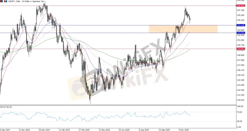 Outlook: Policy divergence between the Fed and BoJ may cap upside in the pair. Consolidation is likely near 158–154, while a clear break below could accelerate selling as the rate differential narrows.