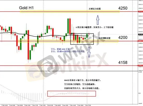 In the latest H1 chart, gold remains stuck in a broad consolidation between $4,250, $4,200, and $4,158, with no clear breakout. Prices are holding above $4,200, but with limited momentum. Although gold is trading above the threshold, recent candlesticks show narrowing bodies and back-and-forth wicks—indicating a weak, directionless market.