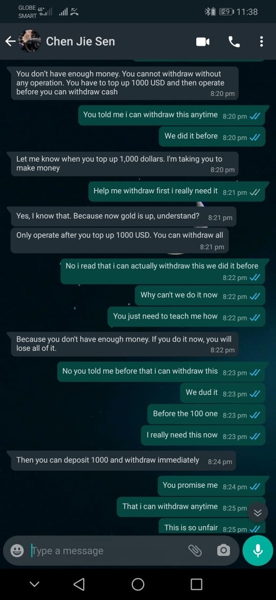 Hindi ako Maka gawa ng pag withdraw dahil tinakasan na po ako ng broker na ito. Sana po ay matulongan nyo po akong mabawi pa ang Aking pera. Salamat