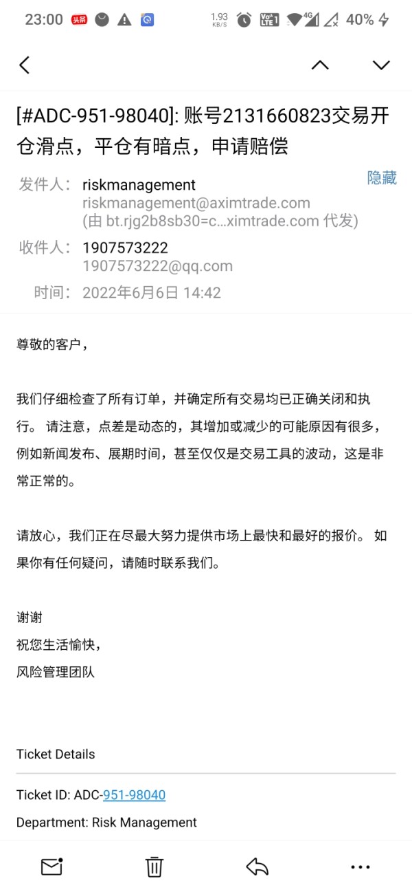该平台开仓大额订单有暗点,小额订单平仓有暗点,开10手欧美和10手黄金都是下单成功直接亏损700左右,小额订单平仓利润直接归零!平台还算有点良心没给我搞成亏损,向平台客服和邮件多次询问,一直不赔偿损失,恳请天眼帮帮我,下面是代理跟我的聊天记录