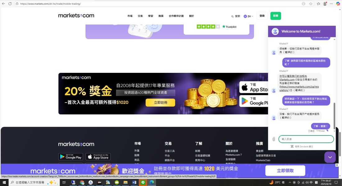 markets.com這間券商客服速度算快,本來已經要準備註冊了客服詢問我所在地區,我回覆台灣,客服說他們不服務台灣區域。 備註 1. 客服對話如附件圖片所示 2. 對話時間:2025.08.18 晚上9:47分左右。