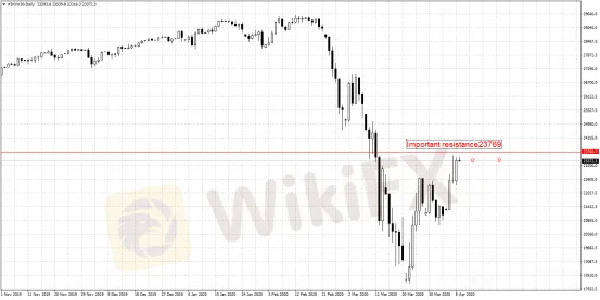 Technically, the rallying Dow Jones Index of US stock market is close to a key resistance level of 23769 at 50% of the descending line from February 12th to March 22nd.