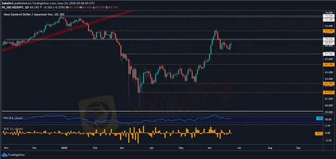 NZD/JPY is currently in the price range between key support of 67.766 and double resistance of 69.897 and 70.030.