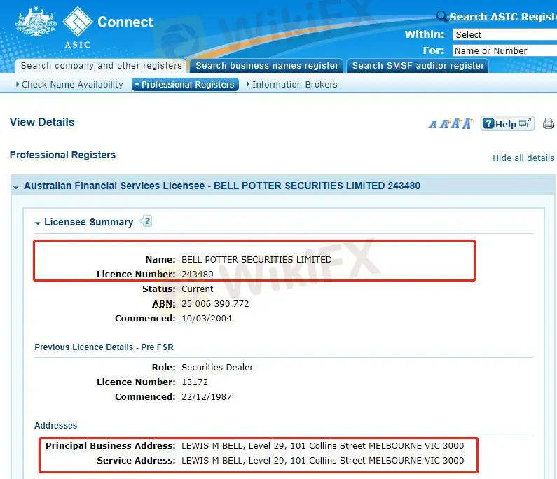 Bell Potters regulatory information on the ASIC