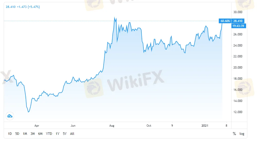 WikiFX News (Feb.1) - Silver opened Monday's Asian trading session with a spike up to 6% at $28.8/ounce. Silver prices could go higher amid the Reddit-fueled boom in highly shorted silver.