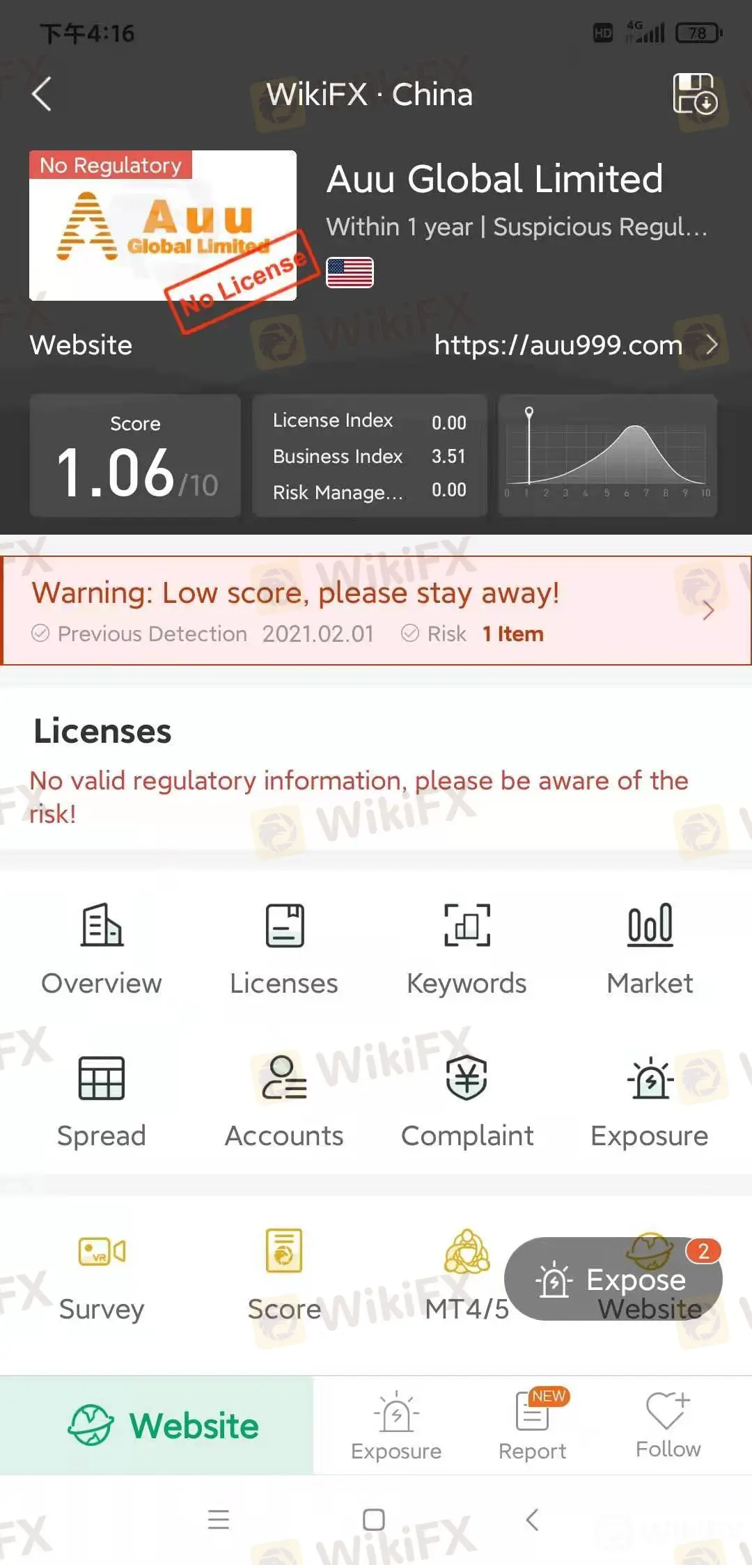 Auu Global Limited only scored 1.06 on the WikiFX APP
