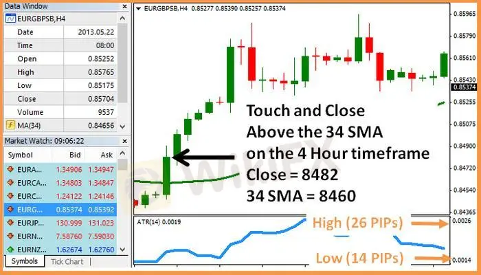 First, I check the 14 period Average True Range (ATR(14)) which I added to all my 4 Hour charts. I add the High and the Low values (displayed on the right) and multiply this by 25% – I place my stop above/below the 34 SMA on the 4 Hour timeframe by this number of PIPs.