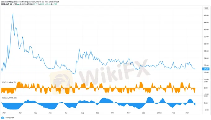 Gold volatility has continued to pullback from its early-March peak, approaching its lowest closing level since November 2020. Gold volatility (as measured by the Cboes gold volatility ETF, GVZ, which tracks the 1-month implied volatility of gold as derived from the GLD option chain) is trading at 17.89, far below the yearly high set during the first week of February at 24.03. The 5-day correlation between GVZ and gold prices is -0.04 while the 20-day correlation is -0.35. One week ago, on March 9, the 5-day correlation was -0.33 and the 20-day correlation was +0.48.