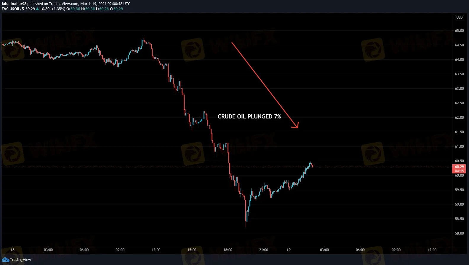 Crude oil prices tumbled nearly 8% as a slowdown in vaccination programs and resurging viral cases in Europe dented the energy demand outlook