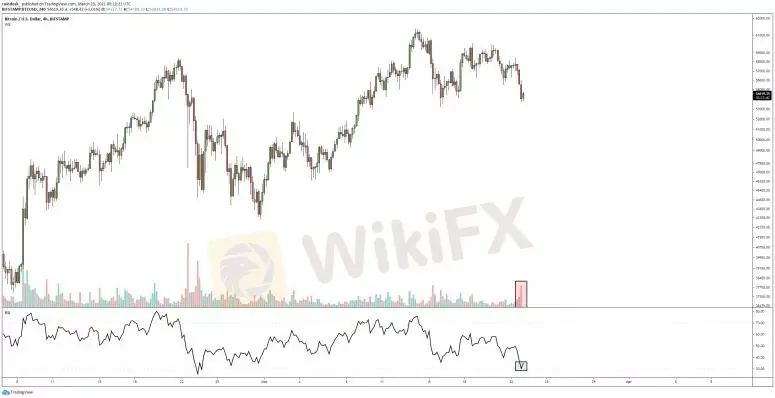 The largest cryptocurrency fell 5.8% over the previous 24 hours, for its largest daily decline since Feb. 23, according to Bitstamp exchange data. Bitcoin's 24-hour range: $53,795.15-$58,407.62.