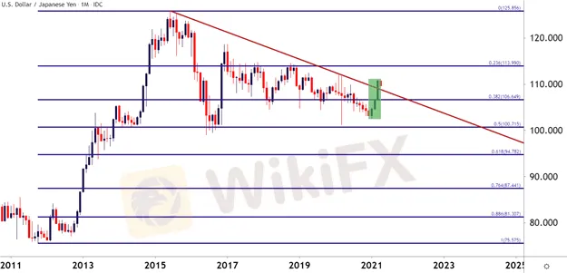 This helped USD/JPY to jump by as much as 8.16% from the January low up to the March high, but perhaps even more compelling than that is the resistance that was taken-out along the way. On the below monthly chart Im looking at a trendline originating in 2015, connecting to the 2020 swing high. That trendline projection caught resistance in early-March and, for about two weeks, held the surging bullish trend at bay. Buyers forced a break later in the month, leading to a fresh yearly high in the pair.