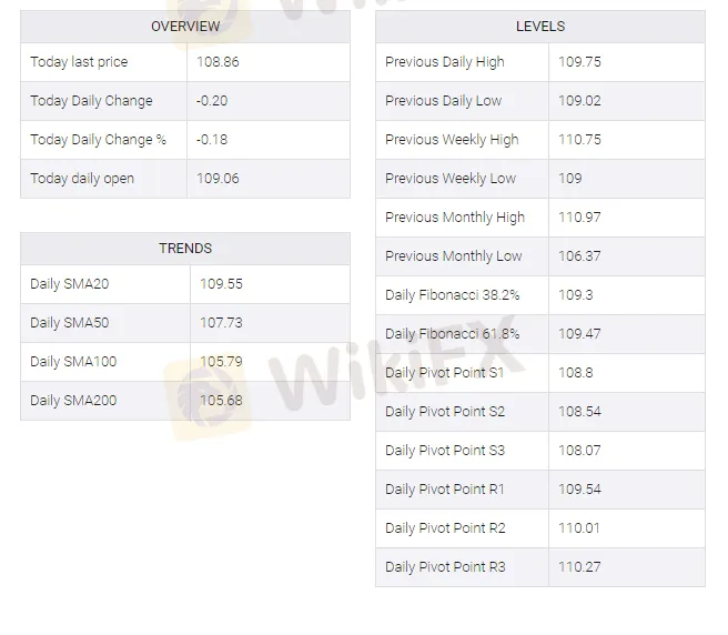 USD/JPY has fallen from a high of 109.07 to a low of 108.82 so far for the day.