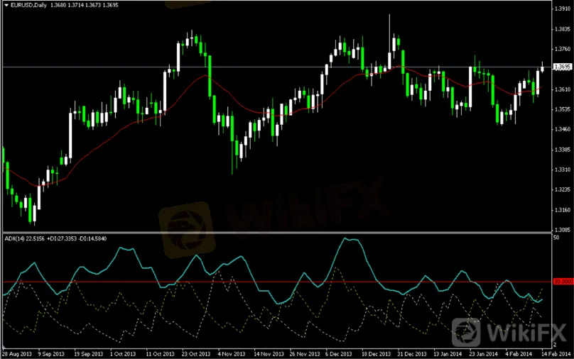 As you can see, the desktop of the strategy consists of one simple Exponential Moving Average (20), applied to Close prices, and the ADX indicator with standard parameters and the marked level 30.