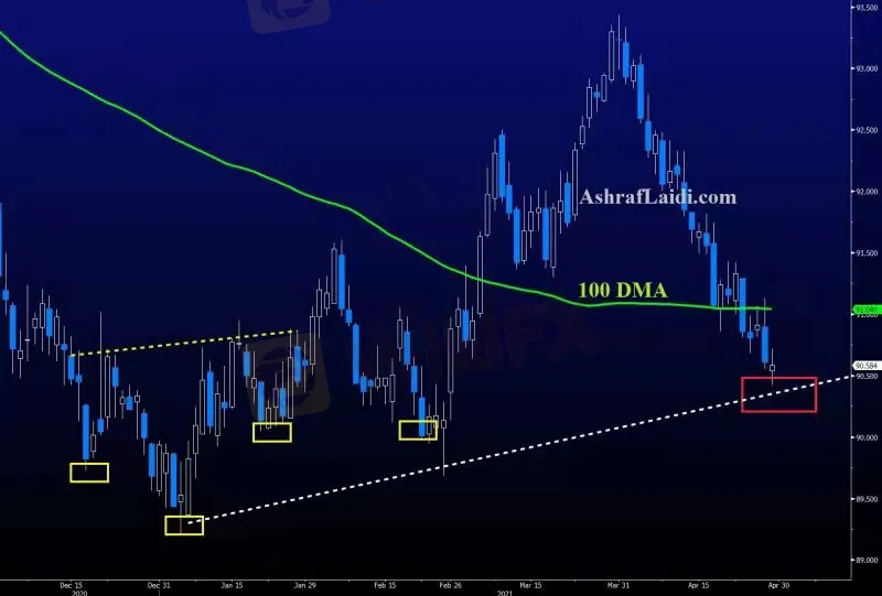 Any illusions that the Federal Reserve would follow the Bank of Canada's lead were shot down by Powell as he preached patience. XAG, CAD and CHF are leading the gains versus USD, while XAU and JPY are the only losers against the greenback. EUR/USD broke above a key trendline resistance, while bond yields are pushing back up as US crude oil regains $65 to break above the $64 right shoulder, and VIX falls under 17. DXY traders watching the trendline support im the chart below.