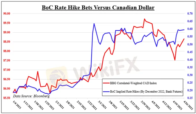 On the chart below, recent strength in the Canadian Dollar has been associated with the markets slightly increasing BoC rate hike bets by the end of 2022. This trend may continue. Having said that, a downside risk for CAD/JPY remains a material downturn in market sentiment given the haven traits of the quote currency. But, a still-dovish Fed this week could continue reducing the downside scope for overall risk appetite.