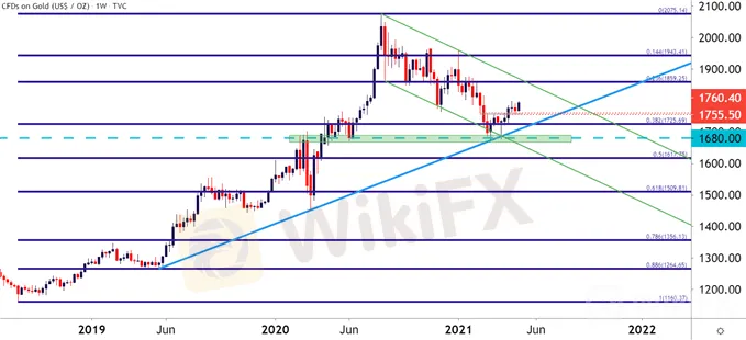 I had looked into this in early-April as Gold prices had built a possible double bottom formation, which is often followed with the aim of bullish reversals. Given the shorter-term dynamics, in which that longer-term bullish trend was being peeled back by sellers, a shorter-term reversal formation presented the potential for the longer-term trend to come back into order.