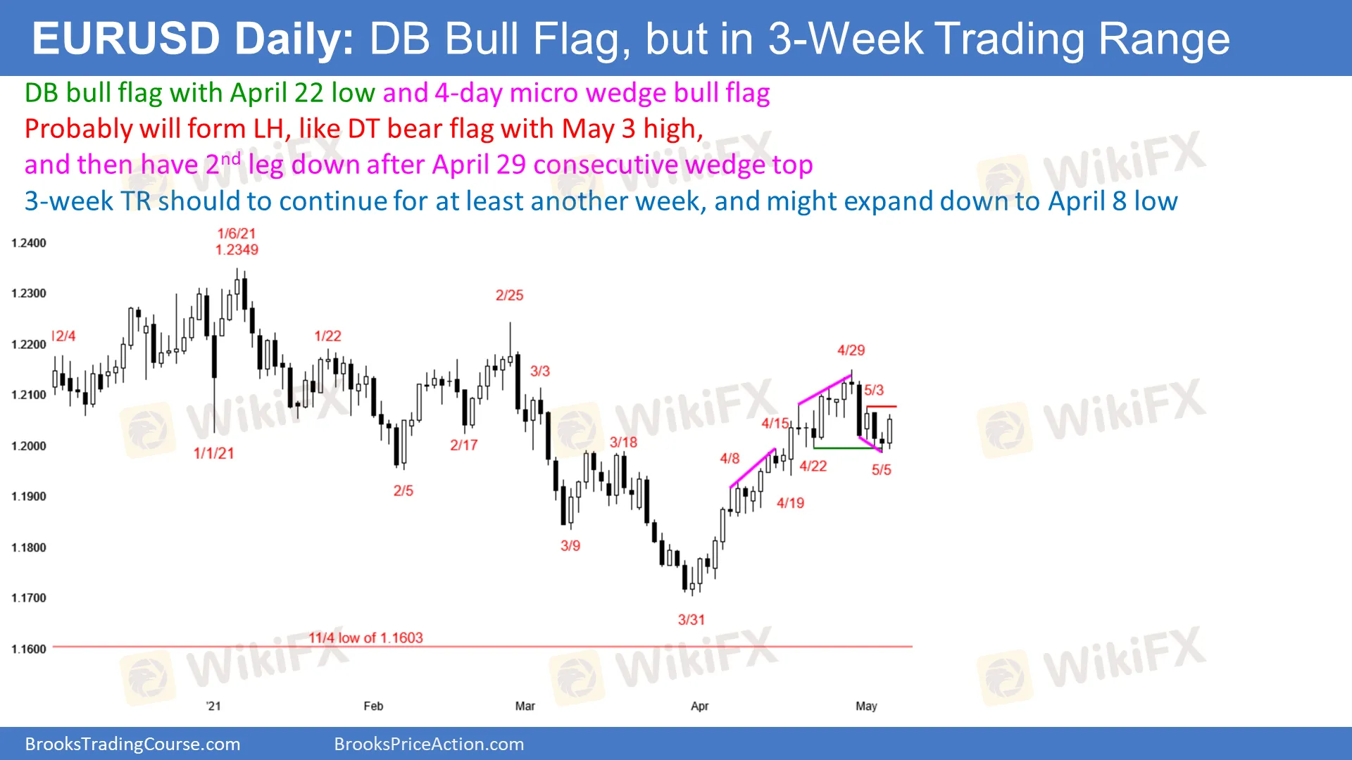 The 2-day reversal up should reach the May 3 high. Traders will then decide between a double top bear flag, or continuing up to the Apr. 29 or Feb. 25 high.