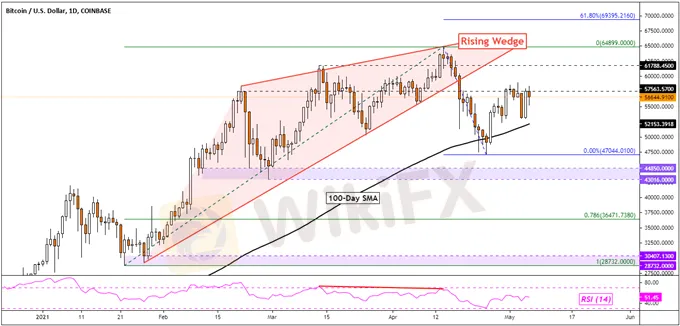 Bitcoin has been struggling to resume its late-April bounce, continuing to idle around the 57563 inflection point set back in February. This is leaving its breakdown out of a bearish Rising Wedge still in play, hinting that BTC/USD remains at risk. Having said that, the 100-day Simple Moving Average (SMA) is maintaining the long-term focus to the upside.