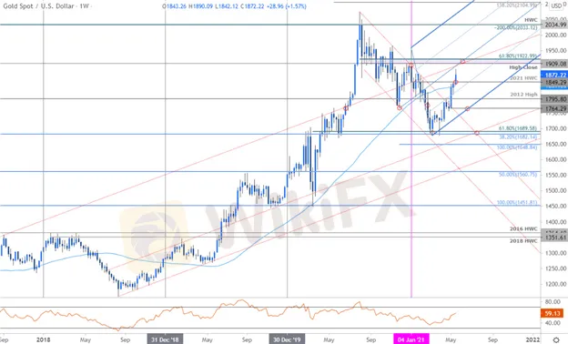 Gold prices rallied for a third consecutive week with XAU/USD up more than 1.5% after breaking to fresh multi-month highs. Gold has now rallied more than 12.6% off the March / yearly low and while the broader focus remains weighted to the topside, the rally may be maturing here as we head into the close of month. These are the updated targets and invalidation levels that matter on the gold weekly charts.