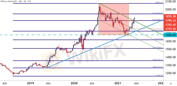 It was the month of March when things began to turn around. Bears remained in-control early in the month, but a low was set at $1680 that was soon revisited a couple of weeks later. At the time, I alerted to the build of a possible double bottom formation which, if it came to fruition, was really exciting because there was finally a short-term justification for strength on the basis of that formation. Double bottoms are often followed with the aim of bullish reversals, but for that to fill in – buyers would need to pose a break of the neckline of the formation.