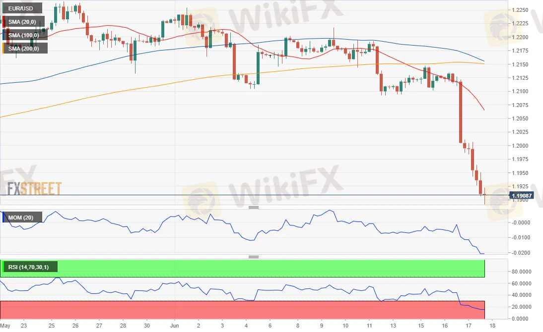 The EUR/USD pair fell further on Thursday, reaching a daily low of 1.1891, a level that was last seen early in April. The dollar kept ruling on the heels of the US Federal Reserve monetary policy decision, as the central bank surprised with a hawkish stance, hinting at possibly two rate hikes in 2023 while upwardly reviewing its growth and inflation forecasts. Stocks showed a late reaction to the latest Feds stance, edging sharply lower during the US afternoon.