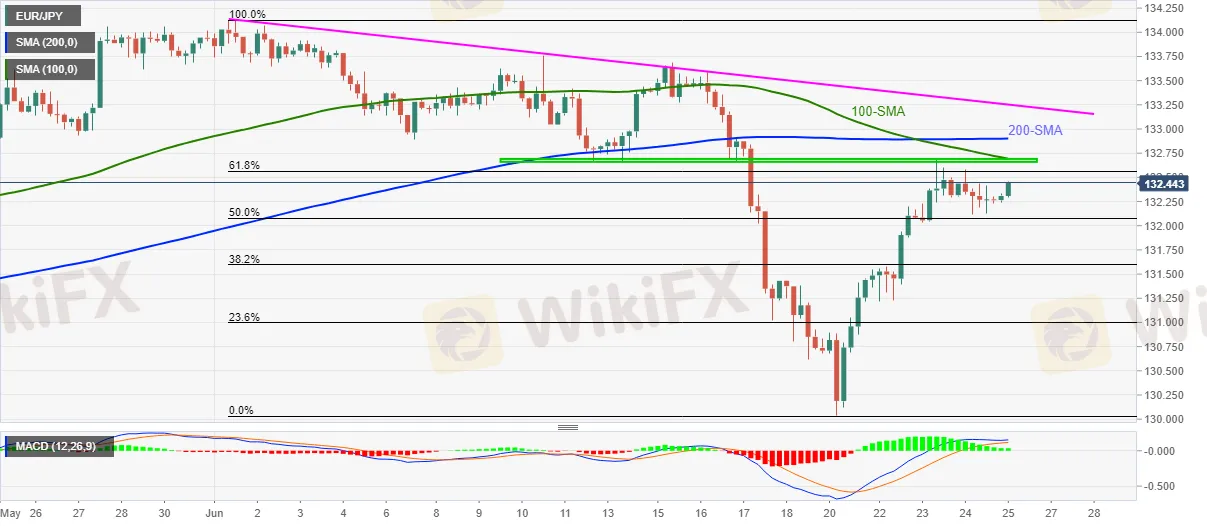 A confluence of 100-SMA and a horizontal region comprising multiple levels since June 11, around 132.65-70, challenges intraday buyers ahead of the 200-SMA level of 132.90.