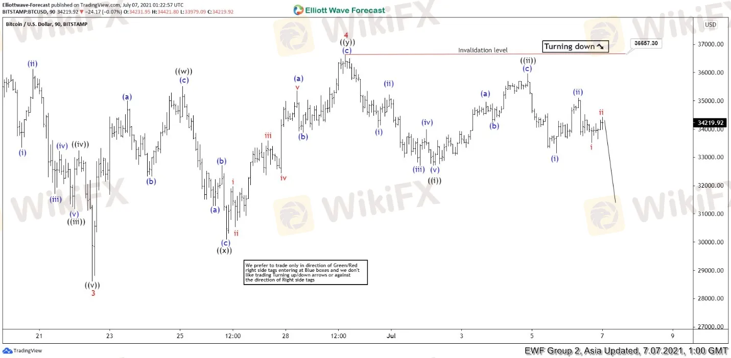Wave 5 is currently in progress with internal subdivision as a 5 waves impulse. Down from wave 4, wave (i) ended at 34049.36, and rally in wave (ii) ended at 35212.12. Wave (iii) ended at 32700.88, rally in wave (iv) ended at 33981.51, and final leg wave (v) of ((i)) ended at 32700.05. The crypto currency then rallied in wave ((ii) which ended at 35960 with internal subdivision as a zigzag. Down from there, wave (i) ended at 33143, and bounce in wave (ii) ended at 35100.49. Near term, while rally fails below 36687.78, expect Bitcoin to extend lower.