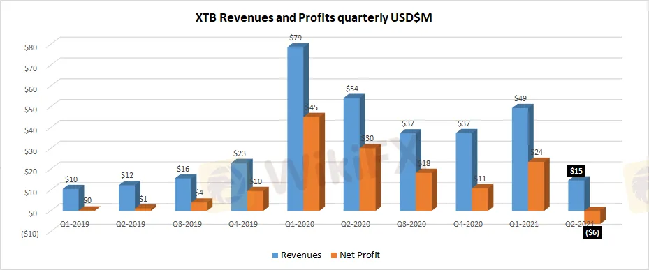 XTB shares plummet 25% after posting $6M Q2 loss, 70% revenue drop