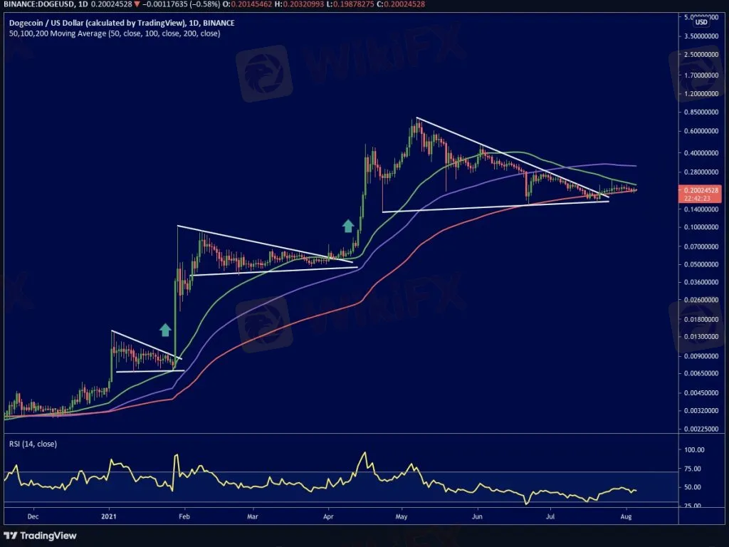 Looking at the daily chart, we see that up until recently, the Dogecoin price was confined to a descending triangle.