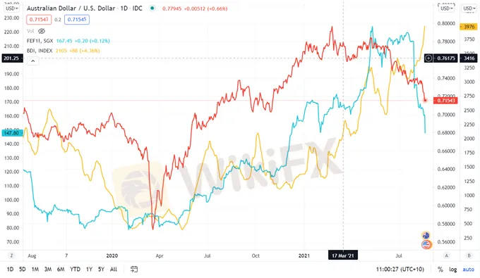 AUD/USD, IRON ORE AND SHIPPING COSTS OF IRON ORE (BALTIC FREIGHT DRY INDEX)