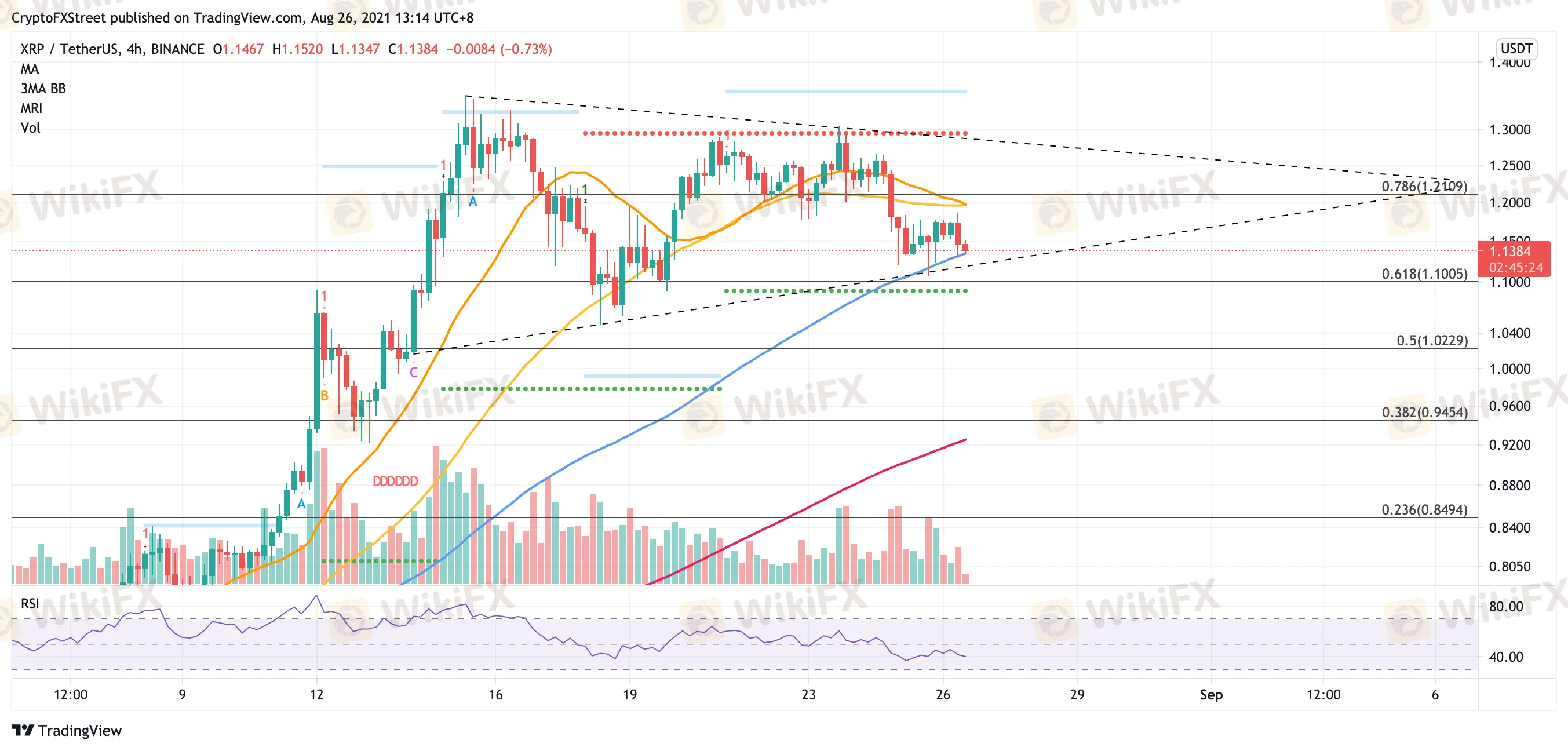 Currently, XRP price is able to find meaningful support via the 100 four-hour Simple Moving Average (SMA) at $1.13. Slicing below this level may expose Ripple to the next line of defense near the lower trend line of the triangle at $1.11.