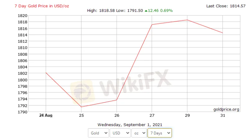 The price of gold is trading at $1,813.88 and between a low of $1,813.33 and a high of $1,814.21.
