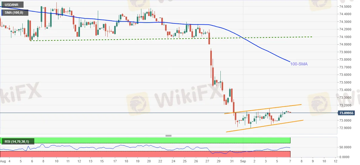 USD/INR retreats to 73.09 after positing the heaviest daily gains in 13 days. That said, the Indian rupee (INR) pair remains inside a bearish chart pattern called bear flag while taking rounds to the three-month low flashed last week.