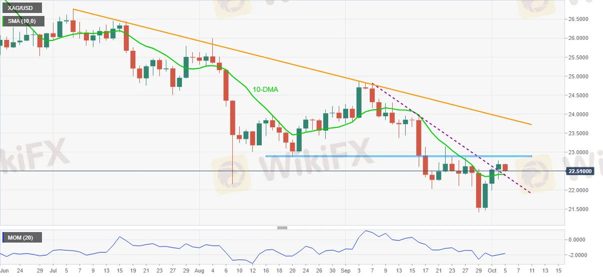 Although failures to cross a six-week-old horizontal hurdle keeps XAG/USD sellers hopeful, a convergence of the 10-DMA and previous resistance line from early September, near $22.40, challenges the quotes immediate declines.