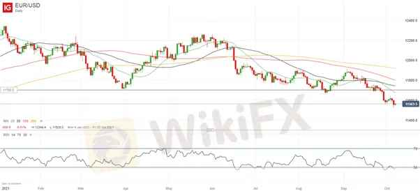EUR/USD has been falling steeply for the past month now, dropping from a recent high just above 1.19 on September 3 to its current levels around 1.1550. Indeed, at one stage last week the pair reached its weakest point since July 2020.