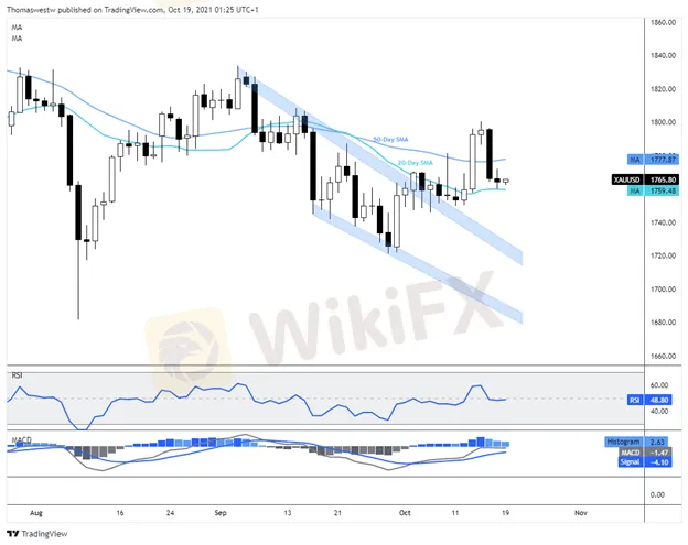 A break below the 20-day SMA could see former wedge resistance turned support come back into play to underpin prices. Alternatively, bulls will look to break above the 50-day SMA before challenging the October swing high at 1800.50, which is the highest level since mid-September.