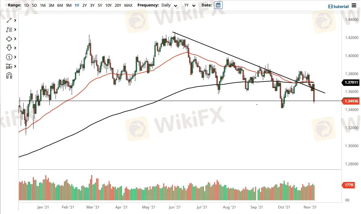 The size of the candlestick is of course very impressive, but at this point in time I think if we turn around and show signs of life, it is possible that we could go higher. However, if we were to break down below the 1.34 handle, and then it could open up a major breakdown. The 1.34 level has been somewhat important, so if we were to lose that, this is a market that will fall apart and go much lower. At this point in time, it is likely that we have a lot of questions asked during the day on Friday, and therefore I think that by the end of the day we should have clarity for the bigger move.