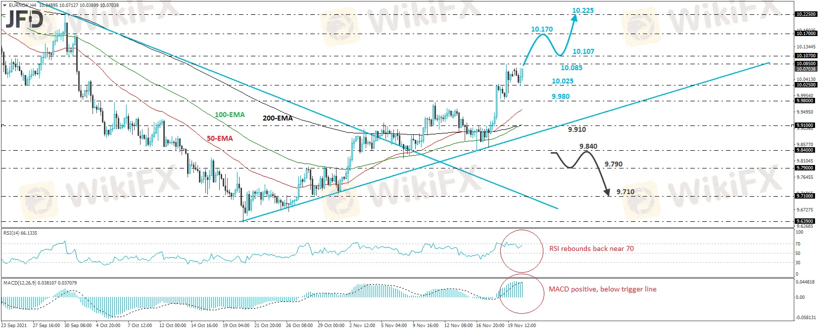 As it was observed from the markets analysis that EUR/NOK traded higher on Friday, breaking above the 10.00 zone, and specifically above the resistance (later turned into support) of 10.025, marked by the high of November 18th. Then, the rate hit resistance at 10.085, and pulled back to test the 10.025 zone as a support this time, But before rebounding back again. Above all, the rate remains above the upside support line drawn from the low of October 20th, which combined with the latest rally paint a positive near-term picture.