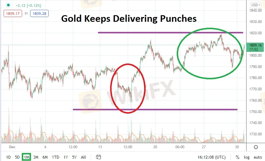 While technical traders contemplate short and mid-term trends of the precious metal, it is certain some fundamentals also were a factor in the price of gold. However, it may actually be tough as a fundamental trader to try and explain the price range of gold displayed in December. The precious metal did not produce a huge jump in value when news about the Omicron variant began to make headlines. Yes, it moved to a high on nearly 1810.00 approximately in the last week of November, which was a move higher, but nervousness really did not break any major price ranges.